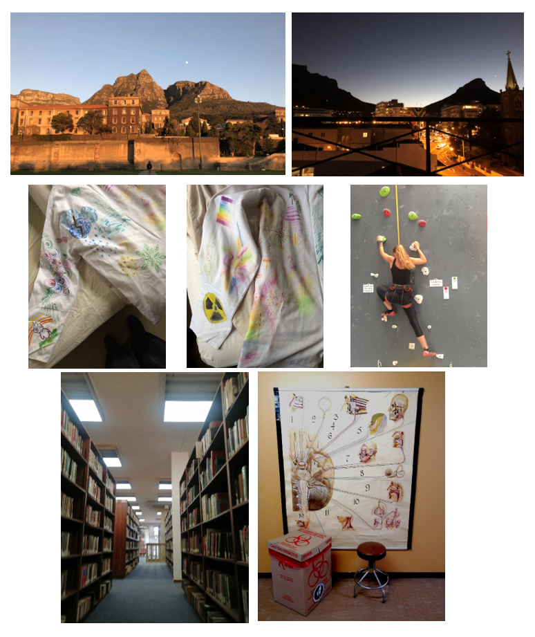 Photos of some “firsts”, from top left to bottom right: University of Cape Town from the field, in my first year; my first night out at The Waiting Room in Cape Town; my first lab coat, painted on by my friends; my first time rock climbing in 2018; my first visit to Wits Education Library; my first day as a Bachelor of Health Science (Honours) in Neuroscience student