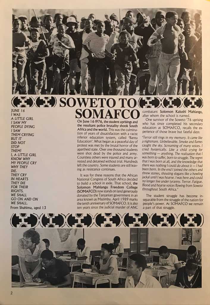 After the Soweto uprising[1], learners directly affected in the 1976 protests and learners from across the country fled into exile fearing for their lives. Many of them crossed South African borders into neighbouring countries. The ANC leadership[2], well aware of this exodus of students, formulated and formed The Solomon Mahlangu Freedom College (SOMAFCO) in 1978 to accommodate all exiled students in Tanzania. The SOMAFCO had a dual role, articulated poignantly by the late Chris Hani, who visited the College in the 1980’s: